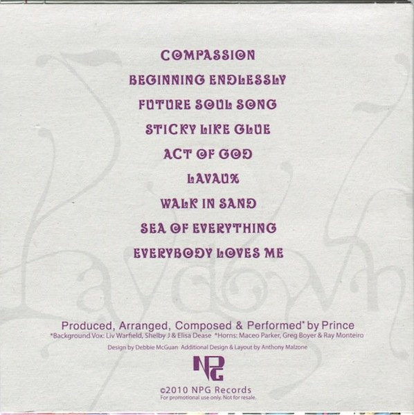 Des bribes d’informations tendent cependant à penser que Compassion a été écrit en 2006 (mais a probablement été ré-enregistrée en partie pour cet album), et qu’elle était candidate à figurer sur Lotusflow3r dans sa version 2008. Future Soul Song est plus ancienne, elle daterait d’une période entre 1996 et 2000 d’après l’ingénieur du son H. M. Buff qui travaillait à Paisley Park Studios à cette époque. Des overdubs sur ce titre sont plus récents. Enfin, Walk In Sand et Sea Of Everything datent initialement de début 2009 mais ont été retravaillées lors de la constitution de l’album.