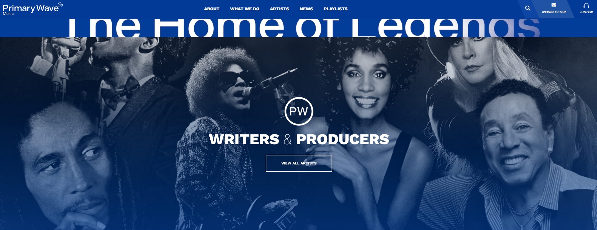 Page d’accueil du site web de Primary Wave (2025) avec un visuel de Prince et d’autres artistes